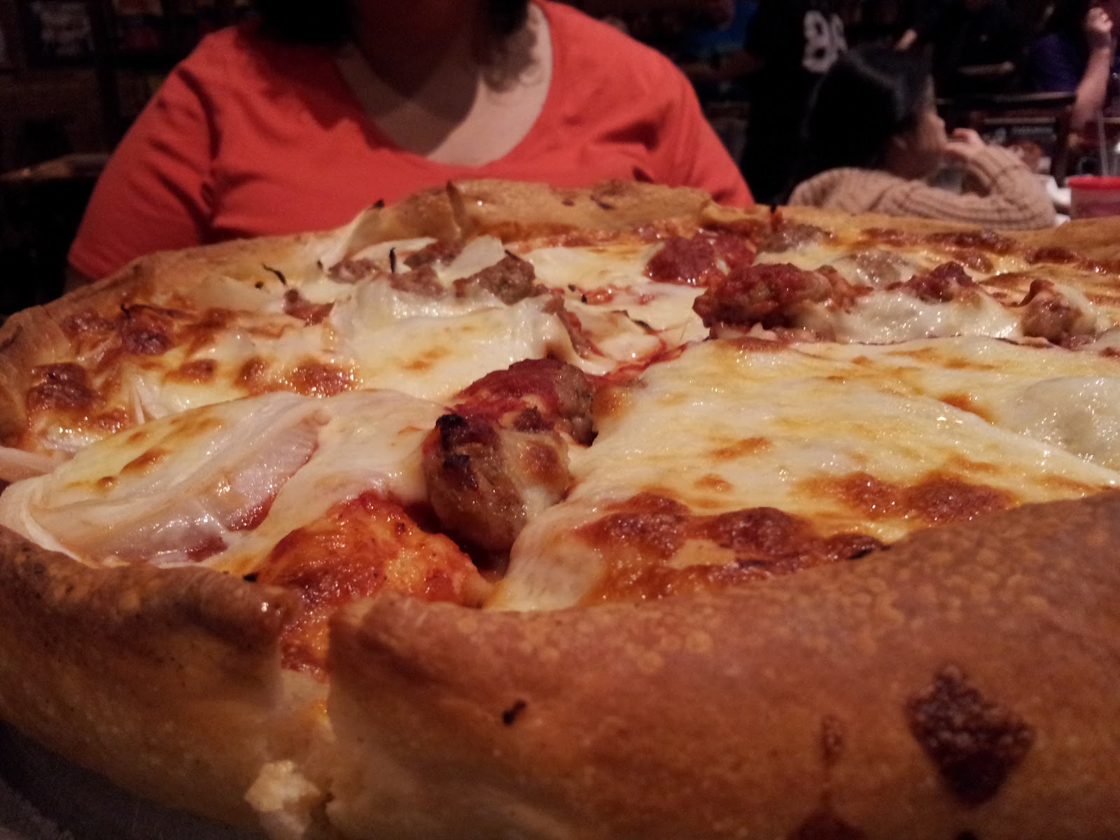 | Giordano's, the night of the Geek Fights annual drunk episode. I don't remember much other than that I got the impression of lasagna with pepperoni and a crust on the back end. |